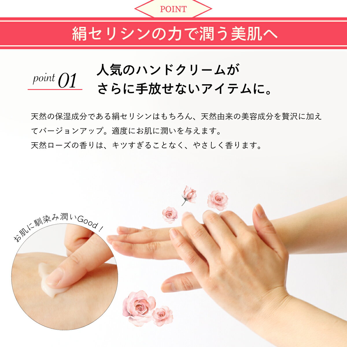 商品名 潤うシルクのハンド&ボディクリーム 天然ローズ 商品コード CS 5325 内容量 50g/1個 パッケージサイズ H:12.5 × W:5 × D:3.5cm 主な美容成分 セリシン、ヒアルロン酸、グリルチリン酸2K、ミツロウ、シアバター、 オリーブ油、ノバラ油、ユビキノン(コエンザイムQ10) 生産地 日本 お届けのご注意【1】 ギフト注文、ご注文者様へお届けの場合 ●商品は、値札シール等、値段のわかるものはすべて外します。