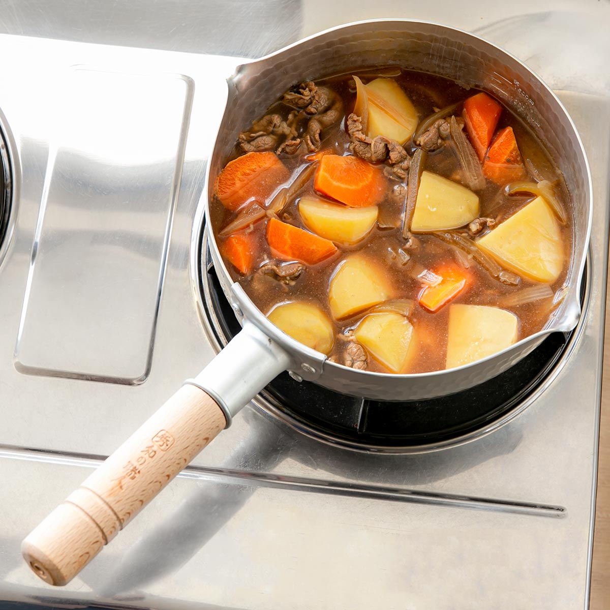 カレーや作り置きしたい煮物に最適なサイズ家族2〜4人分の調理にちょうどいい20cmの雪平鍋です。
