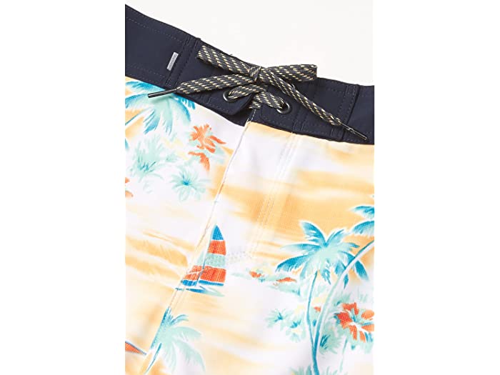 パフォーマンスフィットのスイムトランクスは、疎水性で撥水性のあるDryFlightコーティングを施した4方向ストレッチRepreve生地でデザインされており、全体にトロピカルプリントが施されています。