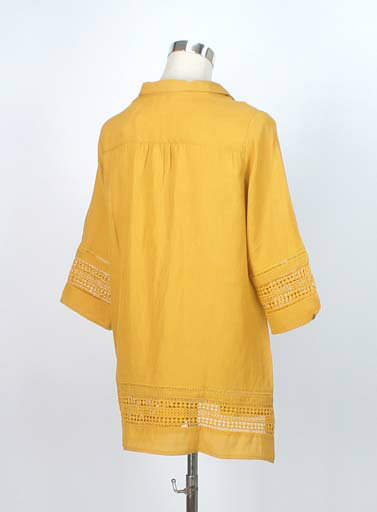 大特価セール!スキッパーデザイン 袖&裾レース使い シャツチュニック 7分袖 大きいサイズ(M~5L)カラシ『39ショップ買いまわり 最大7倍』