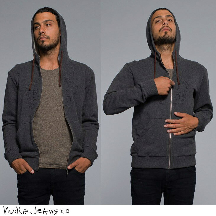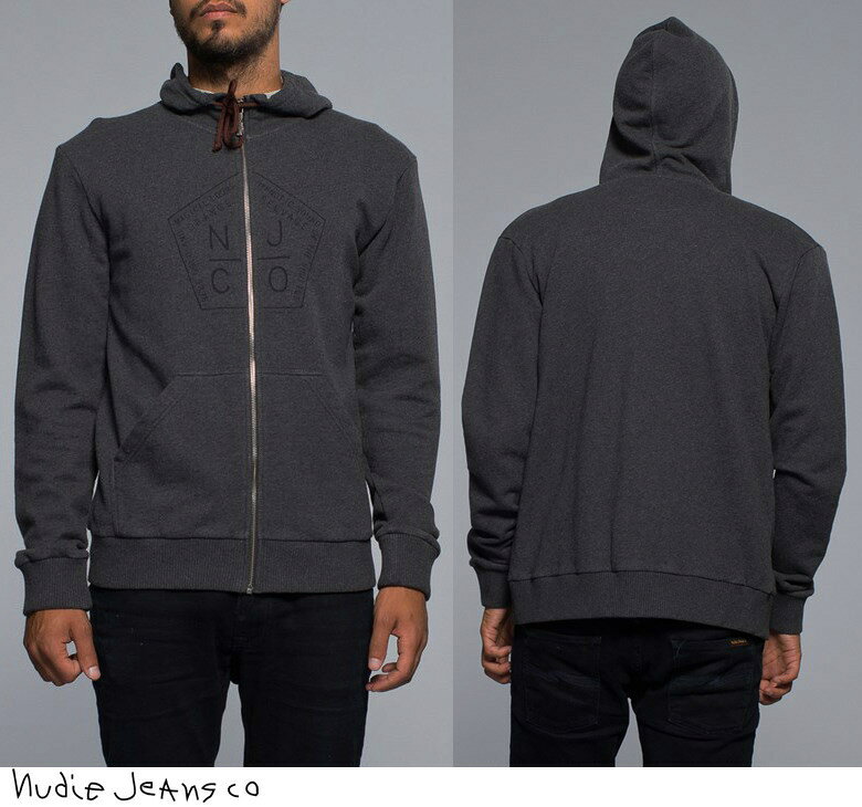 Nudie Jeans co/ヌーディージーンズ SORGARD ZIP HOOD プリント入り、フルジップ・パーカー DARK GREY(ダークグレー)
